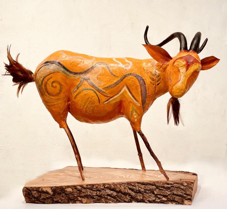 paint, feathers, mixed media, 22"x21"x23"